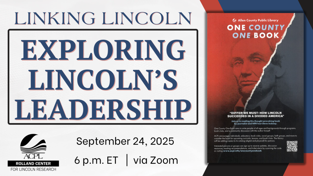 Inspired by Steve Inskeep’s book Differ We Must (2023), join Senior Lincoln Librarians Abbie Meek and Jessie Cortesi of the Rolland Center for Lincoln Research at the Allen County Public Library on Zoom as they explore choices that shaped a nation and discuss President Abraham Lincoln’s leadership navigating the country through an unprecedented civil war. Tune in to check out related artifacts in the Lincoln Financial Foundation Collection and learn more about Differ We Must, ACPL’s featured book in its “One County, One Book” initiative ahead of Inskeep’s visit to ACPL on October 9 to present the 2025 annual McMurtry Lecture sponsored by the Friends of the Lincoln Collection of Indiana, the ACPL Foundation, and Friends of the Library. Join us September 24, 2025, at 6pm via Zoom.