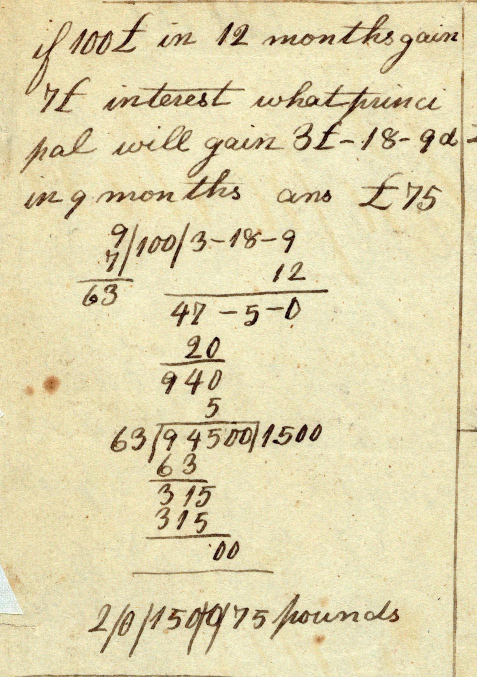 The first problem of this type that he solved in his cyphering book was: “If 100£ in 12 months gain 7£ interest what principal will gain 3£-18S-9d in 9 months?” Such problems also had a special rule which could be applied. Abraham’s solution to the problem is shown in Figure 2. The modern reader would have great difficulty following what AL did, but the future President knew what he was doing and arrived at the correct answer (75 pounds).