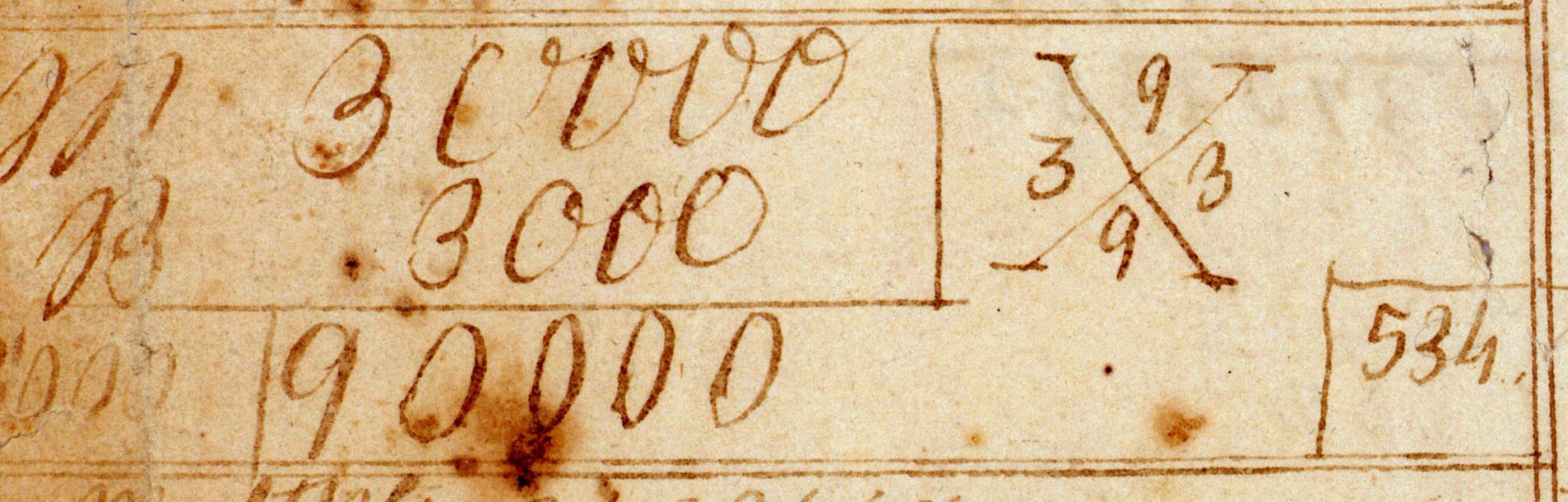 Of the 18 casting-out-nines checks in Abraham’s cyphering book, 17 were correct, and 1 was not. The incorrect check is shown in Figure 4, and the writing was almost certainly done by someone other than AL. The error was to include two 9s in the check—the 9s should have been zeros. So, our conclusion is that in his cyphering book, AL himself carried out 17 casting-out-nines checks, and got all of them correct. Someone else—hopefully not a teacher—did one check, and got it wrong. Furthermore, whoever made that error also seemed to believe that the product of 30000 and 3000 was 90000 (see Figure 4).