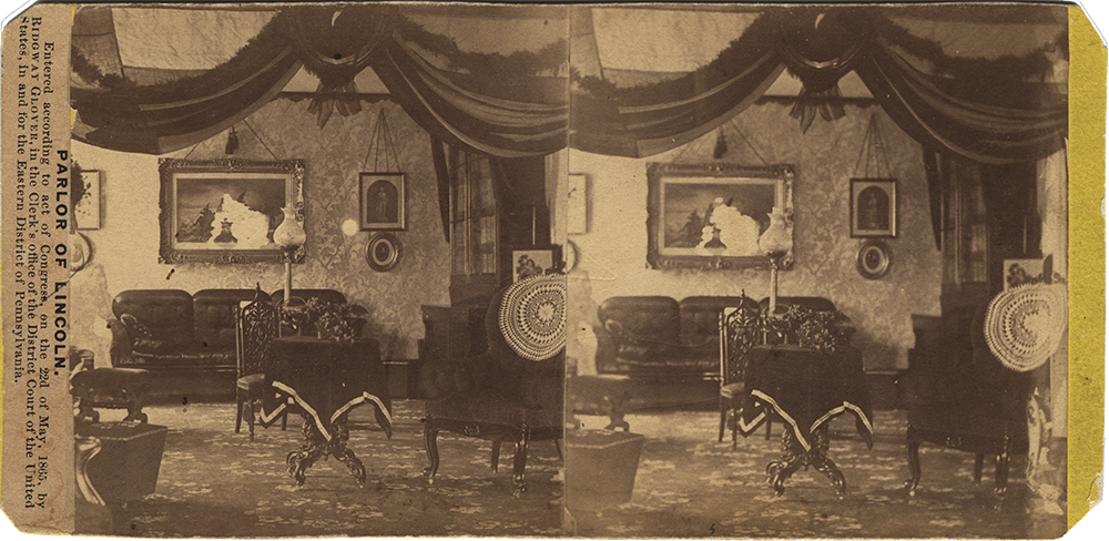 Emanuel Leutze’s 1851 painting “Washington Crossing the Delaware” also helped fix this pivotal moment in Americans’ memories and imaginations. A copy of the epic artwork was put on display in April 1864 at the Great Metropolitan Fair in New York City, where thousands of visitors gazed up at the iconic scene. Prints of the painting could also be purchased and displayed in the home. This stereoscopic view, taken in Springfield in May 1865, reveals a print of Leutze’s painting on the wall of Lincoln’s parlor. The print had not appeared in an engraving of Lincoln’s parlor published in Frank Leslie’s Illustrated Newspaper in March 1861, indicating that it was likely hung by the Tilton family, who rented Lincoln’s home during the Civil War. Nevertheless, Lincoln would likely have been pleased to know that “Washington Crossing the Delaware” graced his parlor wall as he struggled to preserve what Washington had struggled to create.