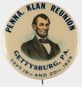 He’s used by folks of all political persuasions and by interests that Lincoln may well have taken issue with—including the Ku Klux Klan. The most unusual Lincoln commemorative pin we have in our collection commemorates the 1925 annual meeting of the Pennsylvania Ku Klux Klan on the battlefield at Gettysburg. Some imagery even positions Lincoln centered between the U.S. and Confederate flags.