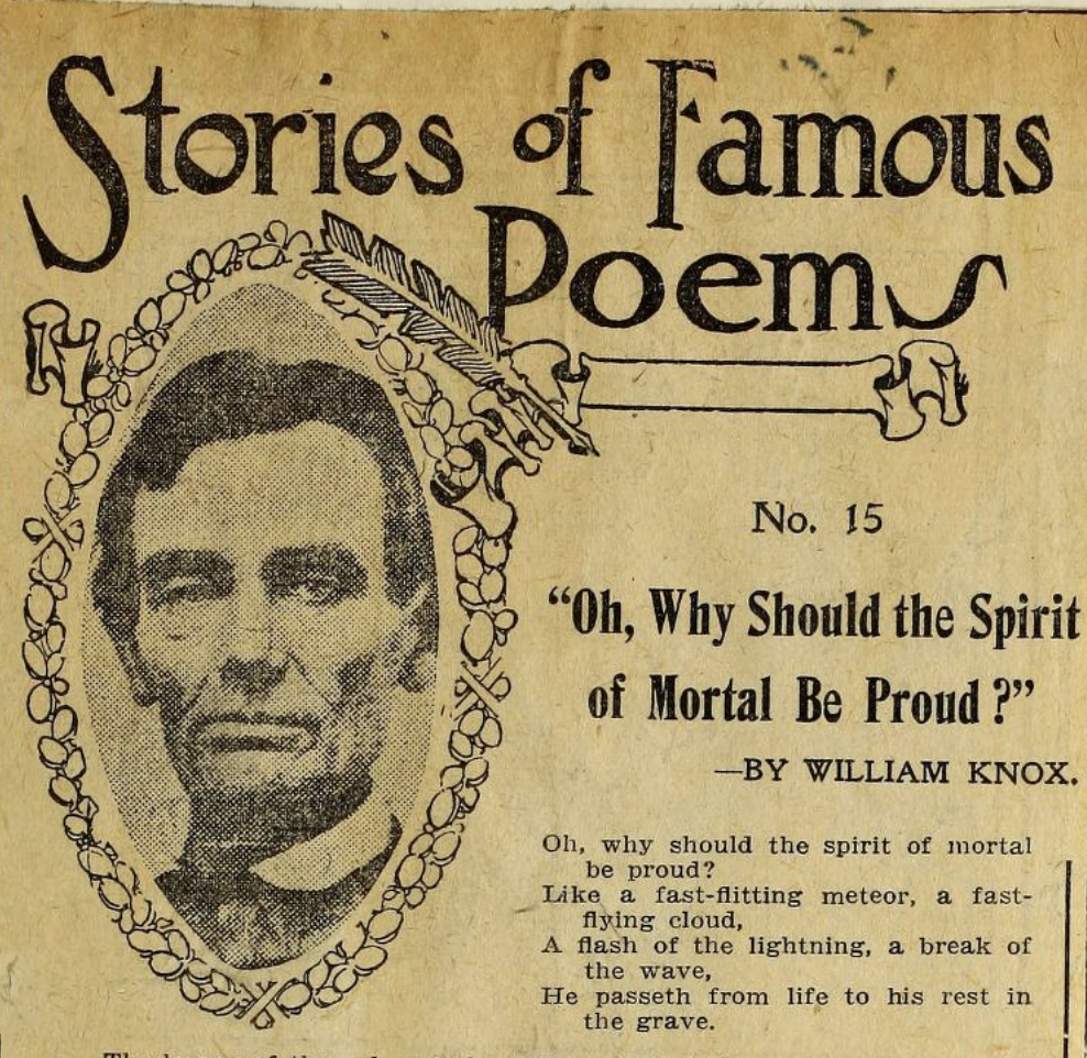 BD: Yes; or at least, one strain of nineteenth century thought, the strain that filtered death and dying through the lens of a morose Calvinistic fatalism. Insofar as Lincoln thought much about death before the war at all, he tended to filter it through his Hardshell Baptist upbringing, with its Calvinist emphasis on the inscrutability of God’s plan. We all die, but no one knows why we die, what purpose it serves, or what comes next; and this sort of acceptance of death’s mystery was integral to Lincoln’s understanding of death. Likewise, Knox’s poetry has that same sense of profound and unknowable tragedy; we die, no one knows why, and we must simply acceptance the sadness and mystery of that fact.