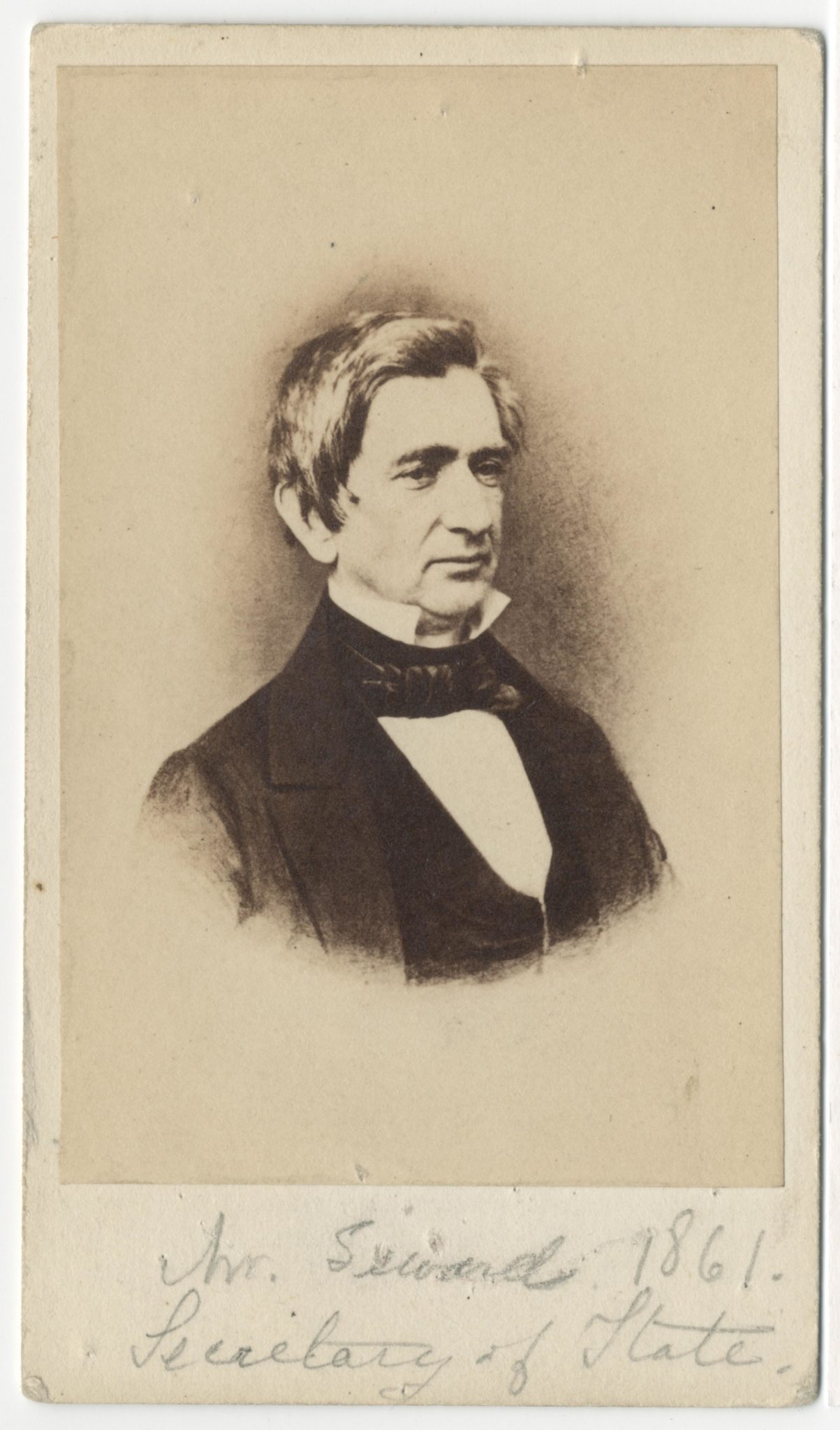 Even so, Seward showed little eagerness to endorse Lincoln. Along his route, Seward praised Lincoln as the Republicans’ “great and glorious leader,” He stopped “in Springfield scarcely fifteen minutes, and for about ten of those fifteen was engaged in talking to the crowd, and for the other five in introducing his traveling party to the President-to-be, with whom he at no time conversed unheard by at least a dozen listeners.” He pledged that “the State of New York will give a generous, cheerful and effective support to your neighbor, Abraham Lincoln,” but he pulled shy of making any personal pledges. Seward could not entirely conceal the “disfavor, if not…contempt” he felt for “a man who, without any special merit of his own, was taken from the subordinate ranks of the party and promoted over his head.”[11]
