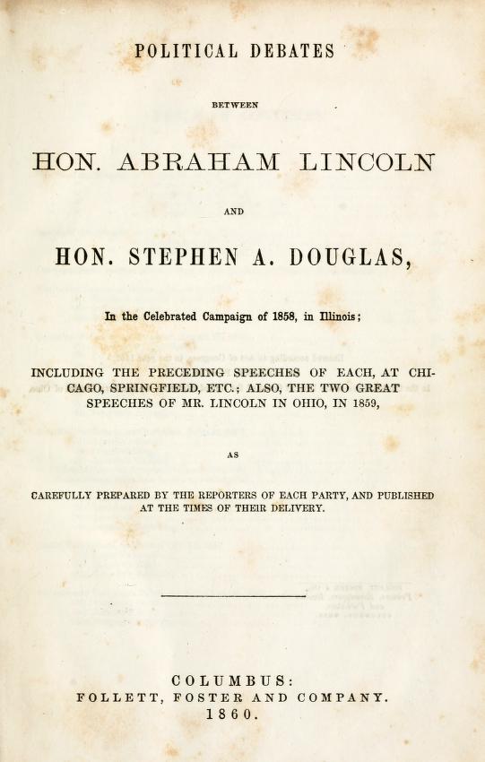 Still, it was Lincoln who seized the initiative to republish the debate; Lincoln who cannily realized that they might yet help him in future endeavors by further circulating his verbal battles with a national figure as prominent as Senator Douglas. At first, Lincoln elicited no interest in the project from publishers, but during a barnstorming tour through Ohio in 1859, found a buyer through a fortuitous accident. Apparently he had taken the bulky scrapbook along with him (no doubt hoping to attract interest along the way), then carelessly left it behind one day in his hotel room. In making inquiries to secure its safe return, he intrigued a local Republican leader who thought it might impress the Columbus publishers Follett, Foster & Co. It did. The book appeared under their imprint just before the 1860 race for president got underway. And it became so successful that it served almost to campaign nationally in Lincoln’s behalf in an age in which presidential candidates did no campaigning on their own.[7] The book sold 30,000 copies in the spring and summer of 1860.